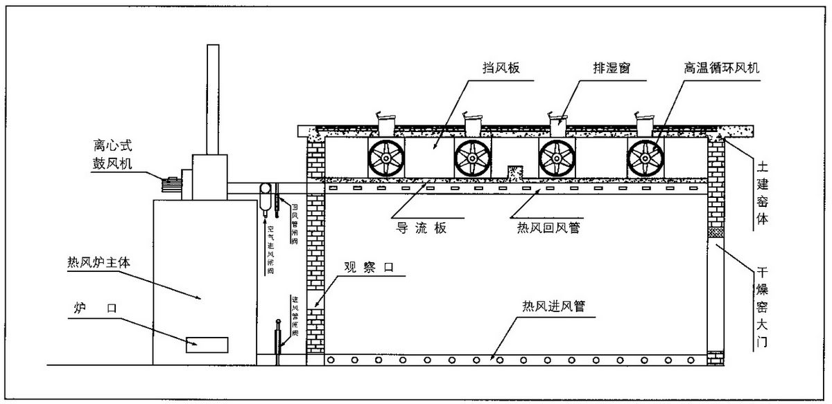 熱風式干燥設(shè)備工作原理是利用燃燒產(chǎn)生的熱能,加熱窯內(nèi)的空氣,由熱風爐頂部主風機將窯內(nèi)的空氣通過管道吸入爐體,將空氣加熱。再通過管道,送入窯內(nèi),由窯內(nèi)的循環(huán)風機不斷的循環(huán)對窯內(nèi)的木材均勻加熱。木材干燥過程中如需要蒸汽,可由熱風爐內(nèi)的蒸汽發(fā)生器提供,如果是一爐兩房或多房時,管道上裝有插閥,通過插閥的調(diào)節(jié)來控制窯內(nèi)的溫度。在干燥的過程中,由于木材要進行排濕,在窯頂上留有排濕孔(根據(jù)地區(qū)而定)和裝有抽濕機,用來調(diào)節(jié)排濕的快慢.